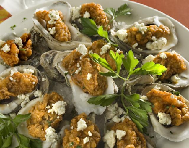 BBQ Oysters with blue cheese dipping sauce Chef Gregg Collier This is a great fried oyster appetizer. This dish can be served on the half shell for presentation purposes. Cook/Prep Time: 1 HourServings: 2 Ingredients 6 Louisiana Oysters, free of sand/grit 2 ounces Barbeque Oyster Sauce (see recipe) 1 ½ ounce blue cheese dressing Seasoned flour Chopped parsley 6 oyster shells Blue Cheese Crumbles Barbeque Oyster Sauce 5 ounces TABASCO Pepper Sauce 2 ½ Tbsp. honey 3 ¼ Tbsp. clarified butter Directions Drain oysters and toss in seasoned flour. Fry until golden. Barbeque Oyster sauce should be kept in a warm place until needed. Toss oysters with sauce and chopped parsley and place in shells. Place shells on dinner plate lined with rock salt with the small end of the oyster facing the middle of the plate. Put blue cheese dressing in bullet and garnish with chopped parsley and place in the center of the place. BBQ Oyster Sauce Combine margarine and honey and warm to 100 degrees. Using a hand blender, add hot sauce in a steady stream. Sauce will emulsify. For service, sauce should be warmed but not heated or sauce will break. Show off your culinary skills. Share pictures of your finished dish on social media and tag them with #LouisianaSeafood!