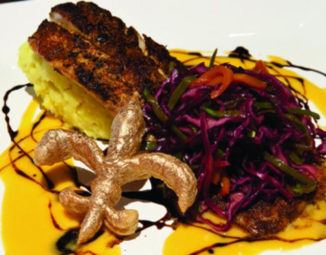 Blackened Redfish with Yukon Gold Purée and Drunken Mardi Gras Slaw Courtesy Juban's Restaurant / Photography: George Long A recipe from the 2010 New Orleans Wine and Food Experience culinary competition. Cook/Prep Time: 2 HoursServings: 6 Ingredients 6 ea 7-8 oz redfish fillets 12 oz. melted butter, unsalted 1 Tbsp paprika 1 Tbsp salt 1 tsp onion powder 1 tsp garlic powder 1 tsp ground cayenne pepper ¾ tsp ground white pepper ¾ tsp ground black pepper ½ tsp thyme leaves ½ tsp oregano leaves ½ tsp marjoram leaves 6 large Yukon gold potatoes, peeled and diced Olive oil Melted butter, unsalted Salt and pepper, to taste ½ head purple cabbage, julienned 2 yellow bell peppers, julienned 2 cups snow peas, julienned ¾ cups Sugar 2 cups Black & Gold Sake 1 cup rice wine vinegar 1 Tbsp soy sauce 1 Tbsp dry mustard 1 tsp Sriracha “Black” Sauce 1 cup Balsamic vinegar 1 Tbsp sugar 4-6 oz heavy whipping cream ½ white onion, chopped ½ lemon, rind removed 1 ½ garlic 2 Tbsp ketchup 2 Tbsp soy sauce 1 # unsalted butter Directions Blackened Redfish: Heat cast iron skillet over high heat. Coat fillets in melted butter, then dust liberally with seasoning mix. Place in the hot skillet and pour a small amount of melted butter over the fillet. Cook for about 2 minutes, until the fish is slightly charred, then flip. Repeat by pouring a small amount of melted butter over the fillet, and cook for 2 minutes longer or until the fish is done. Yukon Gold Purée Cook potatoes in steamer until fork tender. Add olive oil and butter, while whipping, until desired consistency is reached. Season with salt and pepper. Drunken Mardi Gras Slaw Reduce 1 C. sake with 2 T sugar until syrupy. Reduce rice wine vinegar with 2 T sugar until syrupy. Combine cabbage, bell peppers, and snow peas in a bowl. Toss with remaining ½ sugar, and both the sake and vinegar “syrups.” Add remaining 1 C of sake, soy sauce, dry mustard, and Sriracha. Toss well, and season with salt and pepper to taste, if desired. Black Sauce Whisk together, and reduce by 2/3 over medium-high heat. Gold Sauce Add all ingredients, except butter, to a heavy bottom sauce pan and reduce for about 45 minutes to an hour, until mixture is creamy. Cut cool butter in to small pieces and slowly add to the reduction on a low-medium heat. Remove from heat once all butter is melted. Strain mixture through fine mesh Chinois. Show off your culinary skills. Share pictures of your finished dish on social media and tag them with #LouisianaSeafood!