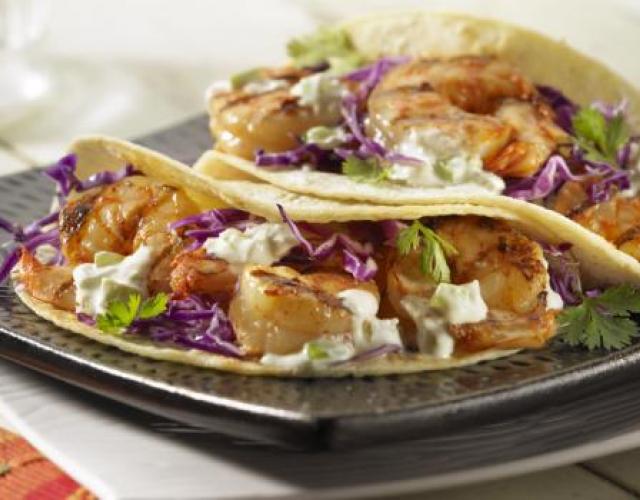 Ceviche-Marinated and Grilled Louisiana Shrimp Tacos Cook/Prep Time: 25 minutesServings: 4, 234 Calories per serving Ingredients 24 each - Jumbo Louisiana Shrimp, 21-25 count, peeled and deveined ¼ cup - Lime juice ¼ cup - Cilantro, chopped 2 cups - Tomato juice 1 cup - Red onion, chopped 1 Tbsp. - Ancho chili powder 8 each - Corn tortillas ½ lb. - Red cabbage, shredded ¼ cup - Tomato salsa ¼ cup - Low-fat sour cream Directions Preheat grill or grill pan to high heat. Mix lime juice, cilantro, tomato juice, onion and chili powder in a bowl. When fully mixed, add in the peeled and deveined Louisiana Shrimp, cover and refrigerate for 20 minutes. Remove shrimp from marinade and place them on the hot grill. Cook until the shrimp are done, 4-6 minutes. Remove shrimp from the grill and place them aside. Lay the tortillas, a few at a time, over the hot grill until warm, 20-30 seconds. Stack on top of each other on a plate. On each tortilla, place 3 shrimp, shredded cabbage, salsa and sour cream. Fold in half. Show off your culinary skills. Share pictures of your finished dish on social media and tag them with #LouisianaSeafood!