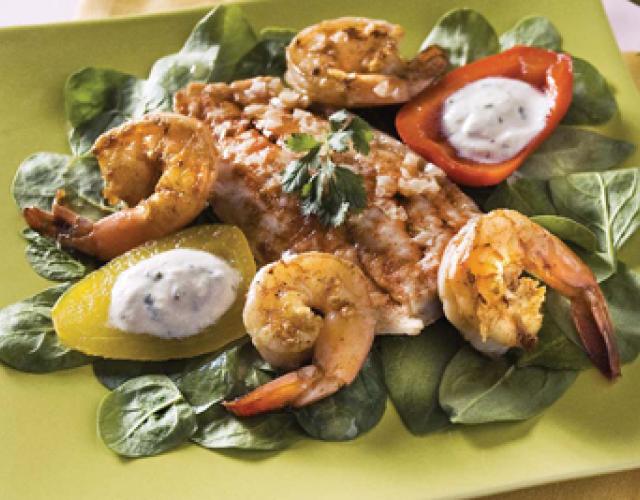 Cold Poached Redfish with Pepper and Pear, Yogurt, and Cilantro Sauce Chef Lazone Randolph Poached Louisiana redfish filets, large Louisiana shrimp with a yogurt dressing, herbs and spices. Servings: 4 Ingredients 1 large yellow pepper 1 large red pepper 16 wild-caught Louisiana shrimp, (26–30 count) headless kosher salt, to taste ground cayenne pepper, to taste 3/4 cup light olive oil, in all 4 6-ounce pieces redfish steaks 4 tablespoons finely chopped shallots 1 rib of celery 1 bay leaf 2 large pears, peeled, cored, and chopped 2 cups low-fat yogurt 2 teaspoons finely chopped cilantro 1/2 pound spring mix or baby spinach juice of 1 small lemon Directions Remove the membranes from the peppers and slice them vertically into 4 pieces each. Peel and butterfly the shrimp, leaving the tail on. Baste lightly with 1/4 cup oil and sprinkle with kosher salt and cayenne to taste. Set aside. Cut 4 pieces of aluminum foil large enough to wrap each fish steak, brush lightly with the remaining 1/4 cup of oil to prepare fish for poaching. Sprinkle each piece of fish with the shallots, kosher salt and cayenne. Place each piece of fish on the individual pieces of foil and wrap tightly to form a bundle. Set aside. In a large saucepan over medium heat, add 6 cups of water, the peppers, rib of celery, bay leaf, and kosher salt. Bring the mixture to a boil and reduce to a gentle simmer; allow to simmer for approximately 5 minutes, add the foil-wrapped fish to the pan and poach for another 15 minutes. Remove the mixture from the stove, draining off the water and discarding the bay leaf and celery. Remove the fish from the foil and reserve 1/2 cup of the poaching liquid from inside the bundles. Chill the poaching liquid, fish, and peppers separately in the refrigerator for at least 30 minutes. Preheat a griddle or grill pan over high heat. Place the shrimp in the pan and grill 3 minutes on each side, until shrimp are pink. Remove from the pan and chill in the refrigerator for at least 20 minutes. Place the pears into a blender and purée. Remove from the blender and place in a strainer to allow any excess liquid to drain. Place in a medium bowl and add the low-fat yogurt. Stir until well blended. Add the cilantro and stir again until nicely incorporated. Remove the shrimp, poaching liquid, peppers, and fish from the refrigerator. Add 1/4 cup of light olive oil and the lemon juice to the poaching liquid and whisk well. Divide the spring mix or baby spinach among 4 large plates. Place the yogurt sauce in the middle of each pepper section. Drizzle the light olive oil mixture over the greens. Place a piece of fish in the middle of each plate, surrounded by 4 grilled shrimp. Position 1 yellow and 1 red pepper section on the side of each plate. Show off your culinary skills. Share pictures of your finished dish on social media and tag them with #LouisianaSeafood!