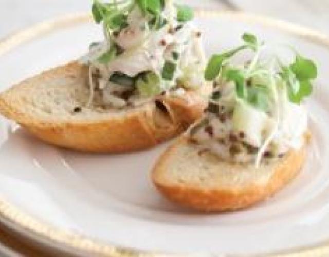 Crab Maison Crostini Courtesy Hoffman Media Try out this elegant crab appetizer at your next party. Cook/Prep Time: 30 MinutesServings: 4 Ingredients 24 (1/2-inch slices) French Bread (from 1 loaf) 1 Tbsp. vegetable oil 1 tsp. kosher salt, divided 1 lb. fresh jumbo lump crabmeat, picked free of shells 3/4 cup chopped celery 1/3 cup mayonnaise 1/4 cup whole grain Dijon mustard 3 Tbsp. chopped capers 2 Tbsp. Champagne vinegar 2 Tbsp. chopped parsley 1 tsp. lemon zest 1/2 tsp. ground black pepper Garnish: micro arugula Directions Preheat oven to 350°. Line 2 rimmed baking sheets with aluminum foil. Lay bread slices evenly on prepared pans. Drizzle oil over bread, and sprinkle evenly with 1/2 tsp. salt. Bake until lightly golden and crispy, about 15 minutes. Let cool to room temperature. Store in an airtight container up to 3 days. In a large bowl, gently combine crabmeat, celery, mayonnaise, mustard, capers, vinegar, parsley, zest, remaining 1/2 tsp. salt, and pepper. Cover, and refrigerate up to 2 days. Spoon 1 Tbsp. crab mixture on each crostini. Top with micro arugula, if desired. Show off your culinary skills. Share pictures of your finished dish on social media and tag them with #LouisianaSeafood!