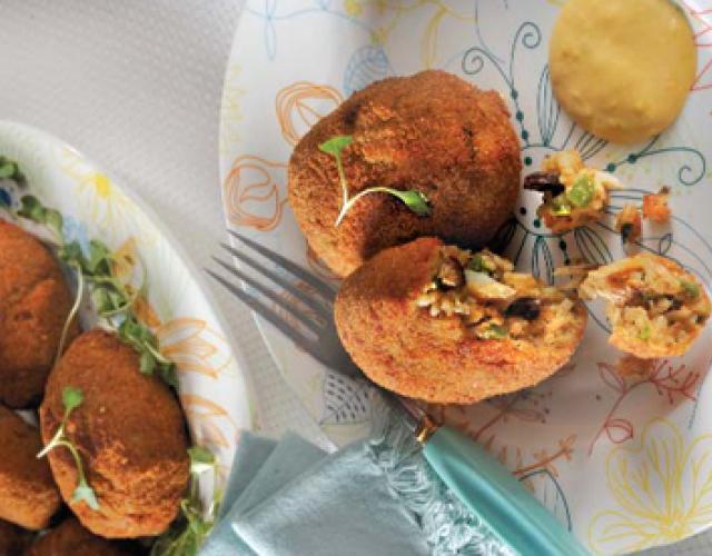 Crabmeat Croquettes Croquettes packed with Louisiana crabmeat, fresh vegetables and herbs then battered and deep fried. Ingredients 3 cups light chicken broth2 cups long-grain rice2 tablespoons unsalted butter1/4 pound Crimini mushrooms, chopped (about 3/4 cup)1/2 medium onion, finely diced1 rib celery, finely diced1/2 small bell pepper, finely diced2 cloves garlic, finely minced1/2 teaspoon kosher salt1/2 teaspoon coarsely ground black pepper1/4 cup thinly sliced green onions4 teaspoons parsley, finely chopped1 tablespoon Frank Davis Seafood Seasoning (or comparable brand)1/2 cup shredded Parmesan cheese1 pound fresh Louisiana crab claw meat3 cups all-purpose flour, seasoned with salt, black and cayenne pepper6 whole eggs1 cup whole milk3 cups seasoned bread crumbs (coarse grind)4 cups peanut oil for frying Directions In a heavy stock pot or Dutch oven, bring the broth to a boil, stir in the rice, and cook it until it is tender but still firm (about 12 to 14 minutes). When it’s ready, pour it into a colander to thoroughly drain (but do not rinse it). Then heat a heavy 12-inch skillet, drop in the butter, and sauté the mushrooms, onions, celery, bell pepper, and garlic until they brown slightly. Now put the rice back into the pot you boiled it in and thoroughly fold in the sautéed seasonings, along with the salt, black pepper, green onions, parsley, seafood seasoning, Parmesan cheese, and crabmeat. To avoid breaking up the crabmeat, add it to the rice mixture after the other seasonings have been folded in. By the way, I suggest you mix the ingredients into the rice while the rice is still hot. At this point, transfer the rice mixture to a cookie sheet so that it can cool (if you leave it in the pot it continues to cook and turns mushy—you don’t want that to happen). When it’s cool enough to the touch, transfer the mix to a large bowl and stir in 3 well-beaten eggs. The eggs are what bind the rice grains together to actually form the "croquette." Next, put the seasoned flour into a large bowl, whip together the whole milk and the remaining 3 eggs to make a “wash,”and place the bread crumbs into another large bowl. This is also the time when you should heat up your peanut oil in a deep-sided frypan to 375°F. When you’re ready to cook, use your hands and form the mixture into small croquettes (about the size of small lemons). Then with a slight amount of pressure, flatten them out so that they are oval shaped. Immediately dust each croquette in the flour, dip it into the egg wash, roll it in the bread crumbs, and gently drop it into the hot oil. Fried at the right temperature on both sides, it should take no longer than 2 to 3 minutes for each croquette to turn crispy, crunchy, and golden brown. When they come out of the oil, drain them on several thicknesses of absorbent paper towels. These croquettes are best when served right away, piping hot, alongside a plate of your favorite butter-sautéed vegetables. Show off your culinary skills. Share pictures of your finished dish on social media and tag them with #LouisianaSeafood!