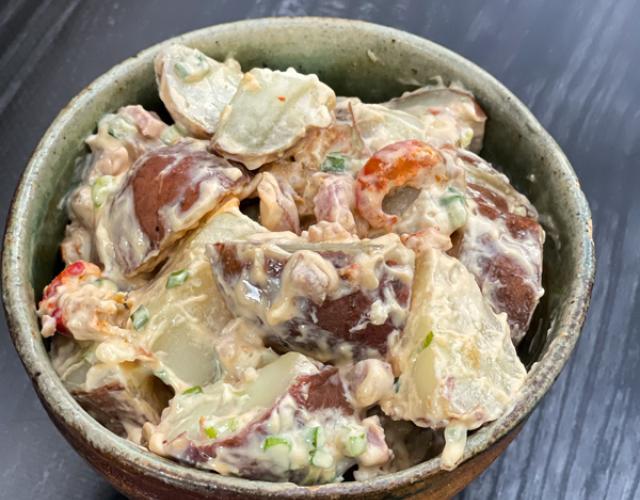 Crawfish Boil Potato Salad The is a great use for "after the boil" potatoes! Ingredients Dressing 1 head garlic, reserved from the crawfish boil 1 pinch kosher salt 2 egg whites 2 tbs Creole Mustard ¼ cup lemon juice 1 cup vegetable oil 1-2 ice cubes if you want it fluffier Potato Salad ½ cup diced sausage, left over from the boil 6-10 potatoes, left over from the boil and cut into bite size pieces 3-4 green onions, chopped Creole mustard, to taste olive oil, as needed salt & pepper, to taste additional fresh herbs, to taste more garlic, to taste Directions Dressing Squeeze out 1 head of garlic into the blender or food processor. Add salt and egg whites. Blend until well combined. Add the Creole mustard. With the blender running on medium, slowly add in lemon juice and vegetable oil. If you’d like to use the mixture as a dip instead of a salad dressing, add in 2 ice cubes and blend for about 30 seconds. That will fluff it up. Double the recipe if serving a crowd, people love it!!! Potato Salad In a bowl add diced sausage & potato pieces. Add dressing by the spoonful, gently folding to coat the mixture. Add ½ the green onions and continue to fold, adding more dressing as needed. Adjust taste with salt and pepper & fresh herbs. Fold in more Creole mustard and olive oil if you find the potato salad too dry. Garnish with chopped green onions and fresh herbs. Show off your culinary skills. Share pictures of your finished dish on social media and tag them with #LouisianaSeafood!