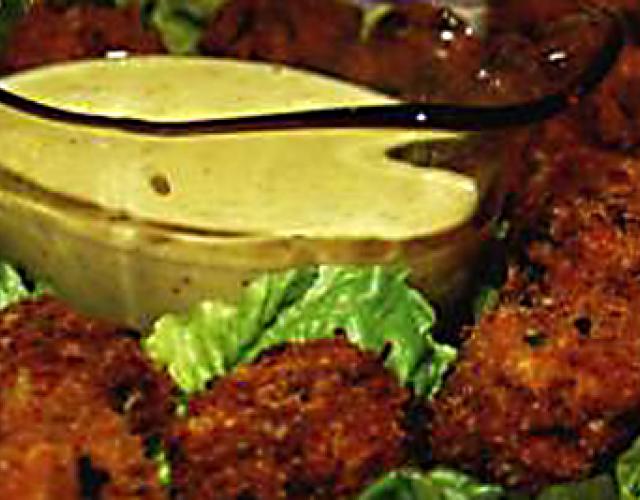 Crawfish Boulettes with Creole Mustard Sauce Jerald and Glenda Horst Fried crawfish and vegetable mixture served with a creole mustard sauce. Ingredients Crawfish Boulettes ½ cup chopped onion ¼ cup chopped bell pepper ¼ cup chopped celery 2 cloves garlic, minced 1 pound crawfish tails 5 slices bread, torn into pieces 1 egg, beaten 3 tablespoons chopped green onion 2 tablespoons chopped parsley 1 teaspoon salt 1 teaspoon red pepper 1 ½ cups dried plain breadcrumbs 1 tablespoon Creole seasoning Oil as needed Creole Mustard Sauce 1 egg 2 cloves garlic, minced 2 tablespoons lemon juice 1 tablespoon chopped parsley 1 tablespoon chopped green onion 1 cup olive oil 1 tablespoon Creole mustard 1 teaspoon salt ¼ teaspoon red pepper Directions Crawfish Boulettes Combine onion, pepper, celery, garlic, crawfish tails, bread, and egg in a food processor. Pulse the mixture. Do not puree. Pour the mixture into a large bowl and stir in the green onion and parsley. Season with salt and red pepper. In a separate bowl, combine the dried breadcrumbs with the Creole seasoning and mix well. By tablespoonfuls, shape the crawfish mixture into small balls. Roll each ball in the breadcrumb mixture. Fill a heavy pot with oil about three inches deep and preheat to 360 degrees. Fry the boulettes until golden brown, about 2 minutes. Drain on a paper towel. Serve hot with Creole Mustard Sauce. Creole Mustard Sauce Place egg, garlic, lemon juice, parsley, and green onion in a food processor and puree. While the processor is running, slowly add the olive oil. Once the mixture is pureed, add mustard, salt, and red pepper. Mix well. Cover and refrigerate for an hour before serving with Crawfish Boulettes. Show off your culinary skills. Share pictures of your finished dish on social media and tag them with #LouisianaSeafood!