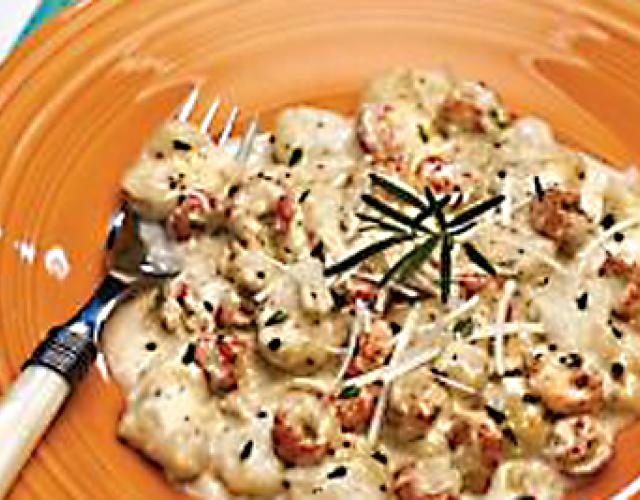 Crawfish Gnocchi Chef Jesus Varguez Roux Louisiana Kitchen A creamy white wine sauce with Louisiana crawfish tails served over gnocchi. Cook/Prep Time: 30 MinutesServings: 6 to 8 Ingredients 2 tablespoons extra virgin olive oil 3 shallots, minced 3 cloves garlic, minced leaves from 3 stems thyme, minced leaves from 3 stems rosemary, minced 1 cup dry white wine 2 cups heavy cream salt and freshly ground black pepper, to taste 8 ounces Louisiana crawfish tails 1 package of your favorite gnocchi, cooked according to package directions Directions Heat the oil in a large saucepan set over medium-high heat. Add the shallots, garlic, thyme, and rosemary and cook until shallots are translucent, about 6 minutes. Add the white wine and increase the heat to high. Cook until liquid is reduced by half, about 5 minutes. Add the cream, reduce the heat to low, and cook until cream is reduced, about 10 minutes. Add the crawfish tails and cook until heated through, about 4 minutes. Season with salt and pepper. Toss with gnocchi and serve. Show off your culinary skills. Share pictures of your finished dish on social media and tag them with #LouisianaSeafood!