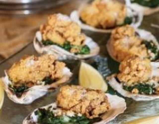 Fried Oysters Over Creamed Spinach Courtesy Hoffman Media A decadent preparation for greens, paired with light and crisp oysters. Cook/Prep Time: 30 MinutesServings: 6 Ingredients 2 (6 oz.) bags baby spinach 2 Tbsp. canola oil 2 cloves garlic, minced 2 Tbsp. heavy whipping cream 2 tsp. anise liqueur 1 3/4 tsp. salt, divided 1/2 tsp. ground black pepper, divided 24 oysters on the half shell 4 cups kosher salt 1 1/2 cups lightly-packed grated Parmesan cheese 3/4 cup panko (Japanese bread crumbs) 1 1/2 cups whole buttermilk 2 cups yellow cornmeal 1/4 cup all-purpose flour 1/4 tsp. cayenne pepper Vegetable oil for frying Lemon wedges, for serving Directions In the work bowl of a food processor, pulse spinach, in batches, until finely chopped. In a large skillet, heat oil over medium-high heat. Add garlic; cook until lightly browned, about 1 minute. Gradually add spinach; cook until wilted, about 5 minutes. Remove from heat. Stir in cream, liqueur, 1/4 tsp. salt, and 1/4 tsp. pepper. Preheat oven to 400°. Remove oysters from shells, reserving oysters. On a rimmed baking sheet, add kosher salt. Add oyster shells, and fill shells with spinach mixture. Top with cheese and bread crumbs. Bake until lightly browned, 8 to 10 minutes. In a shallow dish, add buttermilk. In separate dish, whisk together cornmeal, flour, cayenne, remaining 1 1/2 tsp. salt, and 1/4 tsp. black pepper. In a Dutch oven, pour oil to a depth of 2 inches, and heat over medium-high heat until a deep-fry thermometer registers 360°. Dip oysters in buttermilk, letting excess drip off. Dredge oysters in cornmeal mixture, shaking off excess. Carefully place oysters into hot oil in batches. Cook until golden brown, 2 to 3 minutes. Drain on paper towels. Serve over spinach mixture, and sprinkle with additional salt, if desired. Serve with lemon wedges. *Notes We used Pernod Show off your culinary skills. Share pictures of your finished dish on social media and tag them with #LouisianaSeafood!