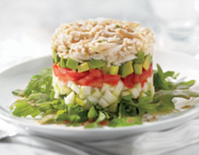 Green Apple, Avocado and Cajun-Spiced Louisiana Blue Crab Layered Salad Servings: 4, 249 Calories per Serving Ingredients ¾ lb. - Louisiana Crabmeat 3 tsp. - Cajun spice 1 Tbsp. - Green onion, chopped ½ lb. - Baby arugula 1 cup - Green apple, cored, diced ¾ cup - Tomato, seeded, diced ¾ cup - Avocado, diced 1 Tbsp. - Creole mustard 4 oz. - Prepared, white wine vinaigrette Directions In a bowl, mix the Louisiana Crabmeat, Cajun spice and green onion; refrigerate until needed. Lay out 4 plates, placing a wreath shape of baby arugula in the center of each. In the center of each wreath, spoon 1/4 cup diced apple and 3 Tbsp. tomato; top with 3 Tbsp. avocado. Combine Creole mustard and vinaigrette with crabmeat and green onion mixture; lay 1/4 cup of mixture on top of the avocado. Show off your culinary skills. Share pictures of your finished dish on social media and tag them with #LouisianaSeafood!