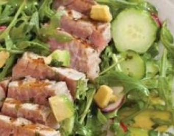 Grilled Tuna Salad Courtesy Hoffman Media Fresh, light and satisfying, with tons of flavor thanks from an herby dressing. Cook/Prep Time: 15 MinutesServings: 6 Ingredients 1 1/2 lbs. sushi-grade tuna (about 2 inches thick) 3 Tbsp. vegetable oil 1 1/2 tsp. kosher salt 1 tsp. ground black pepper 1 1/2 cups baby arugula 1 seedless cucumber, peeled 1/4 cup thinly sliced radish1 avocado sliced Lemon-Herb Vinaigrette 1/4 cup fresh lemon juice 1/4 cup olive oil 1 Tbsp. chopped fresh cilantro 1 Tbsp. chopped fresh parsley 1 tsp. salt 1/2 tsp. ground black pepper Directions Spray grill rack with nonstick nonflammable cooking spray. Preheat grill to medium-high heat (350° to 400°). Cut tuna into 2-inch-wide rectangles. Brush tuna with oil to coat. Season fish with salt and pepper, pressing gently to adhere. Grill tuna, turning often to grill all sides, until 1/8-inch border is opaque but still very rare inside, 4 to 6 minutes total. Transfer tuna to cutting board, and cut across the grain into 1/8- to 1/4-inch slices. Set aside. In a medium bowl, combine arugula, cucumber, radish, and avocado. Add 3 Tbsp. Lemon-Herb Vinaigrette; toss gently to combine. Divide salad among serving plates. Layer tuna over salad. Serve with remaining vinaigrette, if desired. Lemon-Herb Vinaigrette In the container of a blender, add lemon juice, olive oil, cilantro, parsley, salt, and pepper; process 20 to 30 seconds. Use immediately, or cover, and refrigerate up to 2 weeks. Show off your culinary skills. Share pictures of your finished dish on social media and tag them with #LouisianaSeafood!