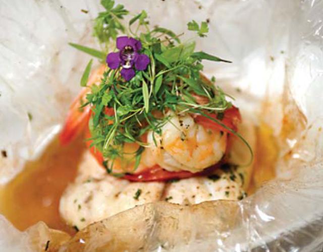Gulf Seafood Cooked in Fata Paper with Creole Tomatoes and Herbs Chef Anthony Spizale Redfish (or speckled trout / flounder) filets baked in fata paper with shrimp stock and herbs. Ingredients 1 4-ounce fresh redfish filet 2 Louisiana shrimp (21–25 count) 2 ounces jumbo lump Louisiana crab meat 1 Creole tomato slice 2 ounces olive oil 2 ounces shellfish stock 1/2 teaspoon sea salt 1/2 teaspoon pepper 2 fresh chives 1 sprig of fresh chervil Directions Cut a piece of Fata paper 20 X 20 inches, brush with olive oil, and place in a small soup bowl to create a cup. Place a slice of Creole tomato in the bottom of the paper cup. Top it with a small filet of fresh redfish (fold if necessary), the Louisiana shrimp, and crabmeat. Add the shellfish stock, salt, pepper, and a few fresh chives and chervil leaves. Gather up the edges, twist, and secure them with a twist tie or a piece of string. Bake the Fata paper pouch in a pre-heated 400ºF oven for about 15 minutes or until it's hot all the way through. Remove the seafood package from the oven and serve it on a very hot soup plate. This will help the steam stay in the package on the way to the table. Grab a pair of trusty scissors and cut the top off the Fata paper, fold back, and enjoy. Chef’s note: You may also use speckled trout or flounder in this dish with great results. You may also cook this dish in parchment paper if you omit the stock and seal it with folds. Editor’s note: You can buy Carta Fata: Professional Cooking Foil in Harahan, LA, at John Koerner Co. Call 800.333.1913 or visit Koerner-Co.com. Show off your culinary skills. Share pictures of your finished dish on social media and tag them with #LouisianaSeafood!