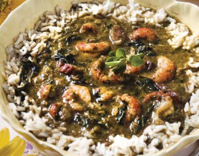 Gumbo Z'Herbes with Tasso Ham and Crawfish Courtesy Wynton Marsalis This is a great recipe with a twist on our traditional gumbo, it features Louisiana crawfish, collard greens, mustard greens, and Tasso ham. Servings: 2-3 Ingredients 3 tablespoons butter 1/2 cup tasso ham, roughly chopped 1/4 cup chopped celery 1/4 cup chopped onion 1/2 cup sliced green onions 1/4 chopped parsley 3 garlic cloves, chopped 1 tablespoon filé powder 1 tablespoon chopped fresh oregano 1 teaspoon Cajun seasoning blend 2 cups sliced collard greens 2 cups sliced mustard greens 1 cup fresh spinach leaves 3 cups chicken broth, divided 3 tablespoons oil 3 tablespoons all purpose flour 2 cups crawfish tails, cooked salt and pepper, to taste white rice, cooked Directions Heat the butter in a large soup pot over medium-high heat. Add the tasso, sauté until lightly browned, about 3 to 5 minutes. Add the celery and onion, and sauté until soft, about 5 to 7 minutes. Add the green onions, parsley, and garlic. Reduce heat to medium-low, stir in the filé, oregano, and Cajun seasoning. Add the collard greens, mustard greens, and spinach. Add 1 cup of the chicken broth and stir to coat. Cover and cook until all greens are tender, stirring occasionally, about 15 minutes. Remove from the heat. Purée the mixture in a food processor and set aside. Heat the oil over medium-high heat in the same soup pot and add the flour, whisk until smooth. Continue to cook, whisking constantly, until the mixture turns light brown, about 10 minutes. Whisk in the remaining 2 cups of broth and bring to boil, whisking often. Add the green purée and simmer for 15 minutes. Add the crawfish tails and season to taste with salt and pepper. Serve over hot rice. Editor’s note: In our gumbo that is pictured, we skipped the purée steps to give the gumbo a chunkier texture. Show off your culinary skills. Share pictures of your finished dish on social media and tag them with #LouisianaSeafood!