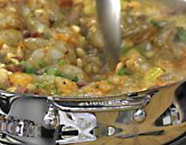 Louisiana Shrimp and Andouille Cassoulet Chef Brian Landry Created by Chef Brian Landry of Galatoire's Restaurant in New Orleans, LA. Ingredients 3 tablespoons olive oil 1 pound andouille sausage (cut into ¼ inch pieces) – other smoked sausage or bacon can be substituted 1 each sweet onion, diced4 each celery stalks, diced 4 each garlic cloves, minced 2 tablespoons plus 1 teaspoon Creole seasoning, separated 1 teaspoon dry oregano10 each whole peeled canned roma tomatoes (approx. 1 - 28 oz can) 3 teaspoons Worcestershire sauce 4 (15 oz can) white kidney/cannellini beans – other white beans can be substituted 3 cups low sodium chicken broth 4 pounds fresh head-on shrimp (16-20 count) 2 teaspoons fresh thyme 1 bunch green onions (chopped) 3 cups breadcrumbs (panko if possible) 1 ½ cups ground parmesan 3 tablespoons olive oil Salt and pepper to taste Directions Peel and de-vein the shrimp. Season with 2 tablespoons of Creole seasoning. Place the shrimp shells in 1.5 quart saucepan with the chicken broth and place over medium heat. Allow to simmer. In a large skillet or small dutch oven, heat the olive oil over medium-high heat. Add the andouille and allow to brown. Next add the onion, celery, garlic, Creole seasoning and oregano and cook until the vegetables are tender and translucent. Next, crush the tomatoes over the skillet and add the Worcestershire. Rinse the beans under cold water, and add to the skillet. Next, add the thyme and green onions. Strain the shells from the broth and add the broth to the skillet. Allow the beans and sausage to simmer for 15-20 minutes. (While the beans are simmering mix the breadcrumbs, parmesan, olive oil, salt and pepper.) Add the shrimp and allow to cook for 8-10 minutes. Cover the skillet with the breadcrumb mixture, and place under broiler for 2-3 minutes until the breadcrumbs are brown. Optional Garnish: Reserve eight shrimp and peel only the body leaving the head and tail intact. Season with Creole seasoning. Heat 2 tablespoons of olive oil in a medium skillet. Cook the shrimp for about two minutes on each side until they are browned and cooked through. Arrange the shrimp on top of the cassoulet once it has been browned under the broiler. Show off your culinary skills. Share pictures of your finished dish on social media and tag them with #LouisianaSeafood!