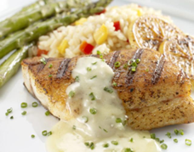 Marinated Grilled Louisiana Drumfish with Grilled Lemon Sauce Tender Louisiana fish grilled and served with zesty lemon sauce. Servings: 8 Ingredients 8 ea Louisiana Drumfish fillets, 8 oz. ea. 2 cups Onions, sliced 2 ea Garlic, whole cloves, crushed 15 ea Lemon slices 2 Tbsp Paprika 1 tsp Cayenne 1 1/2 Tbsp Coriander, ground 12 sprigs Thyme, fresh, whole sprigs 1 cup Olive oil 1 ea Lemon, halved 2 Tbsp Creole seasoning 1 1/2 cups White wine 1/2 cup Shallots, minced 3/4 cup Heavy cream 1 lb Butter, unsalted, cold, 1/2-inch cubes Salt, to taste Pepper, to taste 1/2 cup Chives, chopped Directions Combine water, salt and brown sugar. Submerge Louisiana Drumfish fillets in brine and refrigerate for 2 hours. After 2 hours, remove fillets from brine and pat dry. Season with black pepper and Creole seasoning. Combine onions, garlic, lemon slices, paprika, cayenne, coriander, thyme, lemon slices and olive oil in large bowl or dish. Toss Louisiana Drumfish fillets in marinade and coat evenly. Refrigerate for 2-3 hours or overnight. Prepare charcoal or gas grill. When ready, coat flesh side of the halved lemons in Creole seasoning and grill flesh-side down until blackened. Squeeze juice from lemons and reserve. Combine white wine and shallots in medium sauce pot. Bring to simmer and reduce volume by ½. Add cream and simmer additional 5 minutes. Add butter in pieces while whisking constantly. Add 2 Tbsp. grilled lemon juice and season to taste with salt and pepper. Reserve sauce warm. Remove fillets from marinade and season with salt and pepper. Place fillets skin-side down on oiled grill over medium-high heat. Grill skin side until edges begin to brown and then flip over and cook flesh side for additional 2-3 minutes. Remove fillets from grill. Serve fillets with sauce spooned over and garnish with chopped chives. Show off your culinary skills. Share pictures of your finished dish on social media and tag them with #LouisianaSeafood!