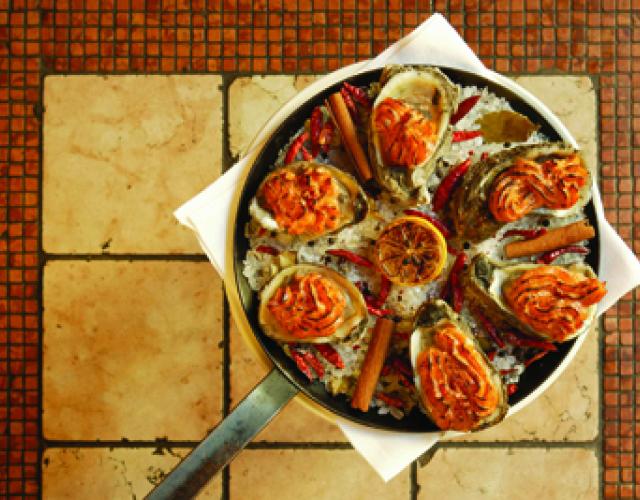 Oysters Fonseca Courtesy Bourbon House and Culinary Concierge Magazine Baked Louisiana oysters topped with Tasso Ham, Parmesean Cheese and Italian breadcrumbs. Yields 2 dozen oysters. Cook/Prep Time: 1 Hour and 30 MinutesServings: 4 Ingredients 2 oz unsalted butter 2 red peppers, minced 2 red onions, minced 1 jalapeño pepper, seeded and minced 2 1/2 lbs tasso, finely ground 2 tomatoes, peeled, seeded and finely diced 2 t fresh thyme, chopped 2 T white wine 1/2 c all-purpose flour 3/4 c oyster liquor 2 T heavy cream 1 oz parmesan cheese, grated salt, black pepper & crushed cayenne pepper to taste French breadcrumbs to cover each oyster 2 doz fresh Louisiana oysters on the half-shell Directions Melt the butter over high heat in a large sauté pan, being careful not to brown the butter. Add the red pepper, red onion and jalapeño, and sweat the vegetables until they soften. Add the tasso and sauté to heat thoroughly. Add the tomatoes and cook until they start to break down a bit, then stir in the thyme. Add the white wine, and stir to deglaze the pan. Add the flour and mix well to incorporate, then reduce the heat to medium and cook for about 5 minutes. Add the oyster liquor and cook for about 10 minutes. Add the cream and grated Parmesan cheese. Adjust the seasoning to taste with salt, black pepper and crushed cayenne pepper. Remove the filling from the heat and allow to cool. Spoon the filling into a pastry bag fit with a medium star tip, and pipe onto fresh Louisiana Oysters on the Half-Shell (about 1/2 - 1 oz per oyster). Top the oysters with breadcrumbs and roast in a 400° oven until the oysters start to bubble underneath the topping, and the breadcrumbs are toasted (about 12-14 minutes). To serve: At Bourbon House, the Oysters Fonseca are served on a bed of rock salt mixed with dried chili peppers and black peppercorns in French roasting pans. Show off your culinary skills. Share pictures of your finished dish on social media and tag them with #LouisianaSeafood!