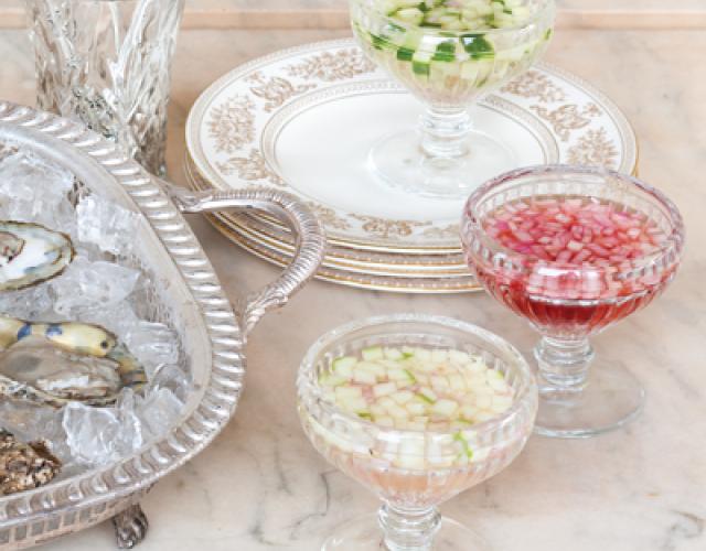Oysters with Mignonettes Courtesy Hoffman Media Sample your freshest oysters with this vinegar sauce trio. Cook/Prep Time: 15 MinutesServings: 12 Ingredients 32 fresh Louisiana oysters on half-shell Cucumber Mignonette 1/4 cup diced cucumber 6 Tbsp. minced shallot 1 cup rice wine vinegar 1/2 tsp. ground white pepper Traditional Mignonette 3/4 cup minced shallot 1 cup red wine vinegar 1/2 tsp. ground white pepper Green Apple Mignonette 3/4 cup diced Granny Smith apple 6 Tbsp. minced shallot 1 cup Champagne vinegar 1/2 tsp. ground white pepper Directions Oysters Arrange oysters on a serving platter filled with crushed ice, and serve with Cucumber Mignonette, Traditional Mignonette, and Green Apple Mignonette, if desired. Cucumber MignonetteMakes About 2 Cups In a small bowl, add cucumber, shallot, vinegar, and pepper; whisk thoroughly. Cover, and refrigerate until ready to serve. Traditional MignonetteMakes About 2 Cups In a small bowl, add shallot, vinegar, and pepper; whisk thoroughly. Cover, and refrigerate until ready to serve. Green Apple MignonetteMakes About 2 Cups In a small bowl, add apple, shallot, vinegar, and pepper; whisk thoroughly. Cover, and refrigerate until ready to serve. Show off your culinary skills. Share pictures of your finished dish on social media and tag them with #LouisianaSeafood!