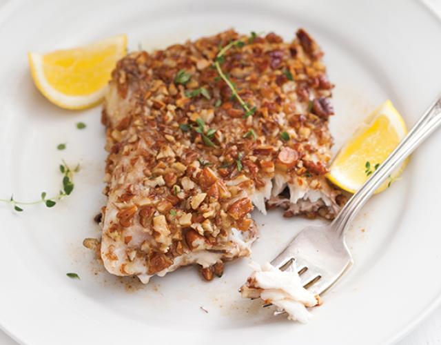 Pecan-Crusted Grouper Courtesy Hoffman Media Pecans add a toasty edge to fresh, crisp grouper fillets. Cook/Prep Time: 30 MinutesServings: 6 Ingredients 1/2 cup all-purpose flour 3/4 tsp. sea salt 1/4 tsp. cayenne pepper 3/4 tsp. ground black pepper 2 large eggs 1 1/4 cups finely chopped pecans 6 (6 oz.) skinless grouper fillets 1/4 cup butter 1/4 cup olive oil Brown Butter Sauce 4 cloves garlic, sliced 1 large shallot, minced 3 Tbsp. butter Directions Preheat oven to 350°. Line a rimmed baking sheet with foil. In a shallow bowl, combine flour, salt, and peppers. In a separate shallow bowl, whisk eggs. In a third shallow bowl, place pecans. Dredge each fillet in flour mixture, shaking off excess. Dip fillet in egg, letting excess drip off. Place fillet in pecan mixture, pressing lightly to coat both sides of the fillet. In a large skillet, melt butter and oil over medium heat. Add fillets, in batches, and cook 2 minutes on each side or until lightly browned. Arrange fillets on baking sheet, and bake 10 minutes or until flesh flakes easily. Serve with Brown Butter Sauce. Brown Butter Sauce In a small skillet, combine all ingredients, and cook over medium heat until shallots are tender and butter is browned. Serve warm. Show off your culinary skills. Share pictures of your finished dish on social media and tag them with #LouisianaSeafood!