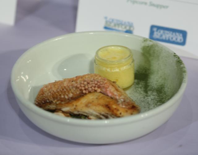 Popcorn Snapper and Mustard Green Spaghetti with Yard Bird Egg Carbonara and Oyster Romano LASCO Dish from Chef Andries Bradley Fresh spaghetti and fresh seafood come together in this savory, delicious match-up. Cook/Prep Time: 45 MinutesServings: 4 Ingredients Popcorn Snapper 3 oz. corn oil 4 4-oz. scale-on snapper fillets, cleaned Blend of sugar, salt, white pepper, granulated garlic and granulated onion Mustard Green Pasta 4 oz. semolina flour 4 oz. durum flour 6 oz. dehydrated mustard green, finely ground 3 egg yolks 3 whole eggs 1 tsp. salt Carbonara in ISI 2 oz. rendered guanciale fat 3 oz. onion 3/4 oz. garlic 12 egg yolks 3 oz. pecorino Romano Salt and black pepper Pickled Okra Caviar Seeds from 8 large red okra 4 oz. apple cider vinegar 4 oz. Steen’s cane vinegar 1/4 cup sugar 1/4 cup salt 1/2 oz. coriander 1/2 oz. white peppercorn 1 bay leaf Pasta Romana 8 oz. mustard green pasta Salt for boiling water 12 gulf oysters, shucked with liquor reserved 1 oz. red chili flakes 2 oz. garlic, processed Reserved water from boiling pasta 2 oz. olive oil 3 oz. pecorino Romano Directions Popcorn Snapper Heat oil in cast iron pan until smoking. Heavily season fish with spice mixture, add fish to the pan scale-side down and cook until scales pop, about 2 – 3 minutes. Flip the fish and cook until cooked through. Mustard Green Pasta Combine dry ingredients in mixing bowl and make a well in the center. Slowly add eggs to the well one at a time and knead by hand until eggs are fully incorporated. Wrap dough in plastic and place in cool area for 30 minutes. Roll out the dough and, using a chitarra, cut the dough into spaghetti. Carbonara in ISI Heat fat in pan, add garlic and cook until tender. Add onions and cook until transparent, then remove from heat and allow to cool to room temperature. In a bowl, whip egg yolks and then add the cooled onion and garlic mixture, salt, pepper and pecorino. Strain through a hand strainer into an ISI, load with cartridges and refrigerate. Pickled Okra Caviar Add okra seeds to a lidded jar. In a saucepan, heat the peppercorns and coriander until fragrant. Add the bay leaf and vinegars and bring to a boil. Stir in sugar and salt. Remove from heat, cool and pour the liquid and seasoning over the seeds. Allow to sit for two weeks. Pasta Romano Boil pasta in salted water until al dente, about two minutes. Drain, reserving some of the pasta water. Heat olive oil in a large skillet and add garlic, cooking until just fragrant. Add chili flakes, oysters and their liquor and cook until oysters blossom. Lower heat and add cooked pasta and pecorino Romano, tossing to combine. Add pasta water a bit at a time to create a sauce. *To serve, plate the pasta with pickled okra seeds and snapper, spooning the carbonara on top. Show off your culinary skills. Share pictures of your finished dish on social media and tag them with #LouisianaSeafood!