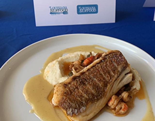 Red Snapper, Crawfish Sofrito Chef Robert Vasquez Ingredients Louisiana Red Snapper: Red Snapper Filet (6oz)4 ea Canola Oil 2 Tbsp Kosher Salt ¼ tsp Course Black Pepper ¼ tsp Crawfish Sofito: Crawfish Tails, clean 5oz Yellow Peppers, diced 2 ea Poblano Pepper, diced 1 ea White Onion, diced 1 small Roma Tomato, diced3 ea Garlic Clove, chopped 2 ea Kosher Salt 1 tsp Canola Oil ¼ cup Butter Sauce: Canola Oil 1 Tbsp Yellow Onion, diced 1 oz Carrots, sliced 2 oz Garlic Clove, whole 2 ea Thyme 1 sprig Bay Leaf 2 ea Black Pepper ¼ tsp White Wine ¼ cup Lemon Juice 1 Tbsp Red Wine Vinegar 1 tsp Heavy Cream ¼ cup Butter, cubed 12 oz Kosher Salt 1 tsp Turnip Puree: Turnips 3 ea Marscapone Cheese 3 oz Kosher Salt pinch Directions Louisisna Red Snapper: In a sauté pan add OIL and heat over medium heat. Dust both sides of SNAPPER evenly with SEASONING. Sear SNAPPER skin side down for 4 minutes. Turn and sear flesh side down for five minutes. Crawfish Sofrito: Add CANOLA OIL to sauce pan. Heat on medium heat. Add all DICED VEGETABLES and CHOPPED GARLIC. Braise for 10 minutes, stirring frequently until gold brown. Finish with SALT. Remove pan from heat. Add CRAWFISH TAILS. Stir mixture evenly. Butter Sauce: Add CANOLA OIL to sauce pot. Heat over medium heat. Add ONION, CARROTS, GARLIC, THYME, BAY LEAF, and BLACK PEPPER. Cook for three minutes, stirring frequently. Add WHITE WINE, LEMON JUICE, RED WINE VINEGAR, and HEAVY CREAM. Continue to cook until liquid is reduced by half. Lower heat. Slowly incorporate SOFT BUTTER, whisking evenly until all BUTTER is added. Pour sauce through a fine sieve into a bowl or sauce pot. Keep warm. Turnip Puree: Dice TURNIPS to ¼” cubes. Place TURNIPS in a steamer and cook for 12 minutes or until soft in the center. Place hot TURNIPS into mixing bowl. Add MARSCAPONE and SALT. Whisk all ingredients until a smooth, mash texture. Show off your culinary skills. Share pictures of your finished dish on social media and tag them with #LouisianaSeafood!
