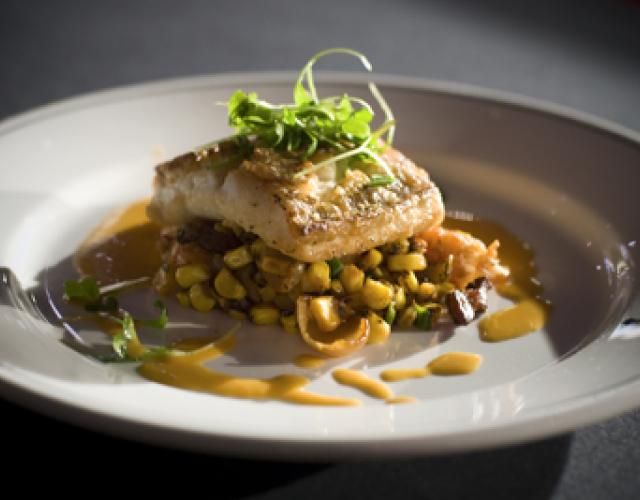 Sautéed Red Snapper - Charred corn, Bacon, Spring Onions & Louisiana Crawfish Chef Nathan Gresham Chef Nathan Gresham of Galatoire's Bistro cooked this dish during the Louisiana Seafood Cook-Off in 2009. A sautéed red snapper filet with creole tomoao and saffron butter sauce. Servings: 8 Ingredients Sautéed Red Snapper 8, 4 oz. filets of red snapper, skin on Grape seed oil, enough to cover pan Flour to dust the fishSalt and pepper Charred Corn, Bacon, Spring Onions, and Crawfish 3 ears of corn 1 cup Louisiana Crawfish Tails 12 each Spring onion, peeled and cut in half 6 oz. Smoked bacon lardon 3 Sprigs of fresh thyme 1/2 Tbspl. Chopped garlic 1 tsp. Creole seasoning Splash of sherry vinegar, to deglaze Salt and Pepper, to taste Creole Tomato and Saffron Butter Sauce 2 ea. Creole Tomatoes, rough chopped 1Shallot, fine diced 2 Tbsp. Tomato Paste 3 ea. Garlic clove, smashed 1 cup Champagne ¼ cup Heavy cream 2 ea. Bay leaf Pinch Saffron, in juice of half squeezed lemon 5 ea. Black peppercorn ½ lb. Cold butter, cubed 1 Tbsp. Butter, soft Directions Sautéed Red Snapper Heat skillet, add the oil to the pan. Season the fish with salt and pepper on both sides; dust with flour. Place fish skin side down into the skillet. With a metal spatula lightly press the fish to ensure even cooking. Cook for about 2 minutes, then flip the fish and cook for another minute. Remove fish from pan and place on a paper towel to rest. Charred Corn, Bacon, Spring Onions, and Crawfish Clean corn of husk. Using a blowtorch or a grill, char the outside of the corn. With a sharp knife cut the kernels of the cob, set aside. In skillet begin to cook down the bacon until crispy. Remove bacon from skillet and add onions. Cook onions until they are tender and have a nice brown color. Add the charred corn, thyme sprigs, crawfish tails, and garlic. Cook for about 2 minutes to bring all the flavors together. Season with salt, pepper, and Creole seasoning. Deglaze with sherry vinegar, stir and take off heat. Adjust seasoning if needed. Creole Tomato and Saffron Butter Sauce In a sauce pot, melt 1 Tbsp of butter, and the shallots, garlic, peppercorns, and bay leaves. Cook on low heat to sweat for 1 minute. Add the chopped tomatoes and champagne; let it simmer for about 2 minutes then add the tomato paste and saffron, lemon mix. Once it has cooked down by half and the cream and continue to reduce. Once the sauce has cooked down to au sec (almost dry) turn off heat and whisk in the cold butter a couple pieces at a time until all the butter has been incorporated. Strain the sauce through a chinois into a metal container. Place in a warm place until ready to use. Toss ingredients together. To Plate:Spoon a small amount of the corn and crawfish mixture onto the middle of the plate and top with a piece of fish, skin side up. Spoon the sauce on the plate around the corn and crawfish mixture. Garnish the fish with the spicy micro greens and serve. Show off your culinary skills. Share pictures of your finished dish on social media and tag them with #LouisianaSeafood!