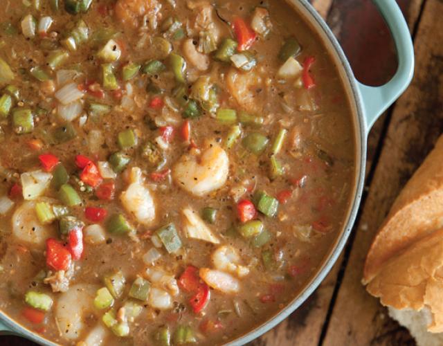 Seafood Gumbo Courtesy Hoffman Media The quintessential Louisiana meal, packed with seafood and loaded with flavor. Cook/Prep Time: 1 Hour: 45 MinutesServings: 8 Ingredients 1 cup vegetable oil 1 cup all-purpose flour 1 1/2 cups chopped onion 1 cup chopped green bell pepper 1 cup chopped red bell pepper 1 cup chopped celery 3 Tbsp. minced garlic 3 cups chopped okra 1 1/2 cups beer, such as Abita Amber 6 cups seafood stock 2 Tbsp. file powder 2 bay leaves 2 tsp. Cajun seasoning 1 (8 oz.) container crab claw meat, picked free of shells 3 tsp. Worcestershire sauce 2 Tbsp. kosher salt 1 1/2 tsp. cayenne pepper 1 lb. medium fresh shrimp, peeled and deveined 1 lb. red snapper fillets, chopped 2 (8 oz.) containers shucked oysters 1 (8 oz.) container jumbo lump crabmeat, picked free of shells 1/4 cup chopped fresh parsley Hot cooked rice Garnish: chopped green onion Directions In an 8-quart stockpot, heat oil over medium heat for about 5 minutes; add flour, and stir together to form a roux. Cook, stirring often, until roux is the color of peanut butter, about 20 minutes. Add onion, bell pepper, celery, garlic, and okra. Cook vegetables, stirring often, for 5 minutes. Add beer, stock, file powder, bay leaves, Cajun seasoning, crab claw meat, Worcestershire, salt, and cayenne. Bring mixture to a boil; reduce heat to medium, and simmer for about 1 hour. Add shrimp, fish, oysters, and lump crabmeat to mixture. Cook for 8 to 10 minutes or until seafood is cooked through; add parsley. Serve with rice, and garnish with green onion, if desired. Show off your culinary skills. Share pictures of your finished dish on social media and tag them with #LouisianaSeafood!