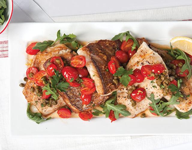Snapper with Tomato and Capers Courtesy Hoffman Media This Mediterranean take on snapper is irresistible and simple to prepare. Cook/Prep Time:30 MinutesServings: 4 Ingredients 4 (6 to 8 oz.) snapper fillets, skin-on, scales removed and scored 1 tsp. salt 1/2 tsp. ground black pepper 4 1/2 tsp. olive oil 2 cups arugula 2 Tbsp. white wine Zest and juice of 1 lemon 1 pint grape tomatoes, halved 2 Tbsp. capers 2 tsp. chopped fresh parsley Directions Season snapper fillets with salt and pepper. In a large skillet over medium-high heat, add olive oil. Once oil begins to smoke, add snapper, skin-side down, and cook until skin is crisp, about 3 minutes. Flip fillets, and cook until fillets flake easily when tested with a fork, about 2 minutes more. Transfer fillets to a plate with arugula. In the same skillet, add wine and lemon zest and juice, and bring to a boil. Add tomatoes. Using the back of a spoon, lightly mash the tomatoes. When liquid has reduced by half, add capers and chopped parsley. Pour over snapper, and serve immediately. Show off your culinary skills. Share pictures of your finished dish on social media and tag them with #LouisianaSeafood!