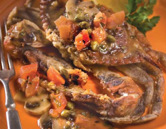 Soft-Shell Crab Basilica Chef Andrea Apuzzo Marinated soft-shell crabs, pan fried and served with a white wine and stock sauce. Ingredients Marinade 2 tablespoons freshly squeezed lemon juice 2 tablespoons white wine 1 tablespoon Worcestershire sauce 8 drops Tabasco 4 large Louisiana soft-shell crabs salt and fresh ground black pepper, to taste Crabs 1/3 cup pure olive oil 1/4 cup all purpose flour Sauce 1 tablespoon pure olive oil 1 tablespoon chopped white onion 1 teaspoon minced garlic 2 Roma tomatoes, chopped 1/3 cup white wine 1 cup fish stock 1 cup sliced mushrooms juice of 1 lemon 1/4 teaspoon Tabasco 1 tablespoon capers 1/2 teaspoon salt 4 tablespoons unsalted butter 1/4 cup chopped fresh basil Directions Marinade Combine the marinade ingredients and pour over the soft-shell crabs. Marinate for 5 minutes, turning the crabs in the liquid. Season with salt and pepper. Crabs Heat the olive oil in a large skillet. Dust the crabs with flour and brown on all sides, then set skillet in a preheated 400°F oven until crabs are firm to the touch, about 5 to 7 minutes. While the crabs are in the oven, prepare the sauce. Sauce In a separate pan, heat 1 tablespoon of olive oil and sauté the onion and garlic until golden, then stir in the tomatoes. Add white wine and let it reduce, then add the fish stock and all remaining ingredients. Heat thoroughly. Place a soft-shell crab on each plate and spoon the sauce over the top. Show off your culinary skills. Share pictures of your finished dish on social media and tag them with #LouisianaSeafood!