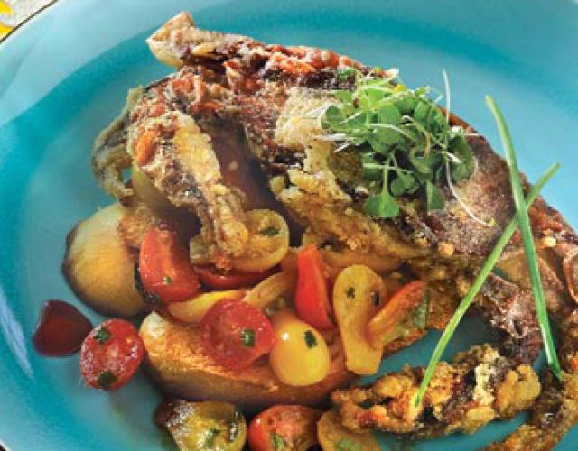 Soft-Shell Crab Lettuce and Tomato Sandwich Chef John Besh, Restaurant August A fried soft-shell crab served open-face over toasted brioche and dressed with fresh vegetables. Cook/Prep Time: 20 MinutesServings: 1 Ingredients 1 Louisiana soft shell crab, dressed 1/4 cup canola oil 1/4 cup seasoned flour 1/4 cup cornmeal 1/4 cup mixed red, yellow, and green grape tomatoes, peeled 1 dash 25-year-old balsamic vinegar 1 pinch minced chive 1 tsp. extra-virgin olive oil 1 slice brioche or challah, toasted 2 tsp. your favorite aioli 1 pinch micro greens 1 pinch lettuce sprouts Salt and pepper to taste Chive oil for garnish Beet juice for garnish Directions In a sauté pan, heat the canola oil over a medium-high flame. Season the crab with salt and pepper. Toss into a mixture of seasoned flour and cornmeal. Place the crab into hot canola oil and allow to cook for 1 minute on each side. Season the tomatoes with salt, pepper, vinegar, chives, and olive oil. Place the tomatoes over a well-toasted brioche and place into a serving plate. After cooking the crab, remove and allow it to drain over some absorbent towels for a moment. Place the crab over the tomatoes and top it with a dollop of aioli, which you in turn cover with a pinch of micro greens and lettuce sprouts. To serve, garnish the plate with additional chopped chives, chive oil, and beet juice. Show off your culinary skills. Share pictures of your finished dish on social media and tag them with #LouisianaSeafood!