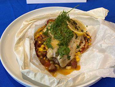 Entrees Redfish en Papillote with Sweet Corn and Local Pea Succotosh; Topped with Parsley & Spinach Pesto Make It